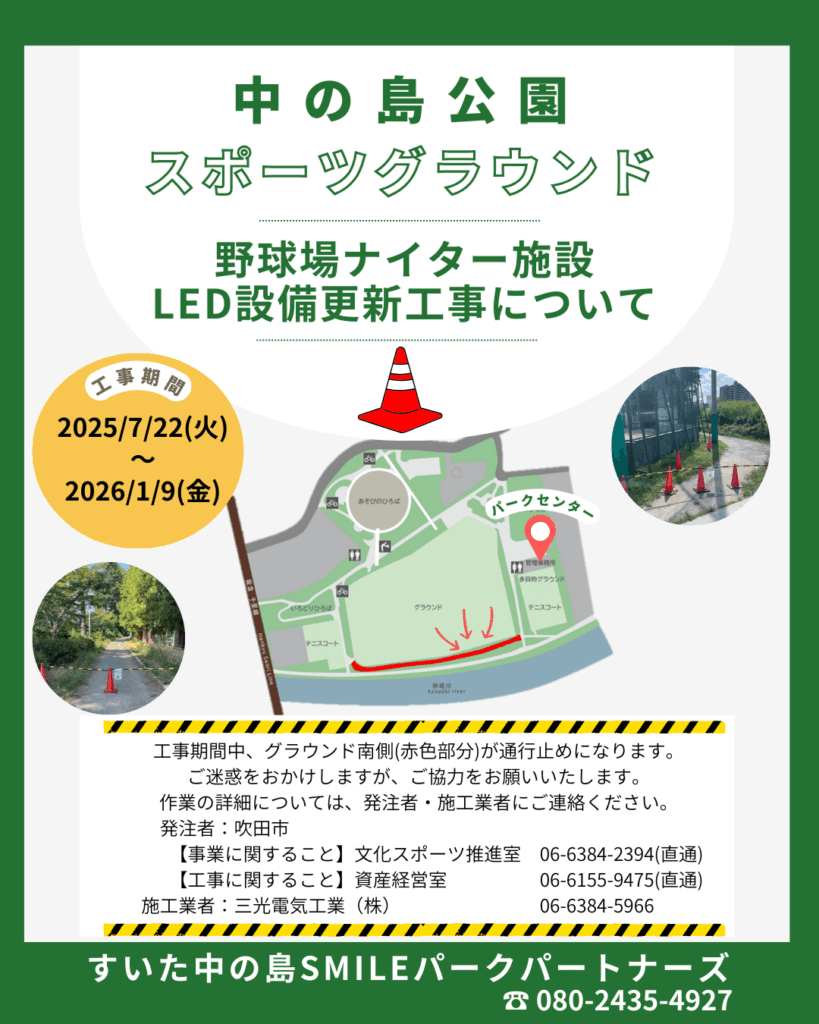 中の島スポーツグラウンド(野球場)のLED照明設備更新工事に関するお知らせです。